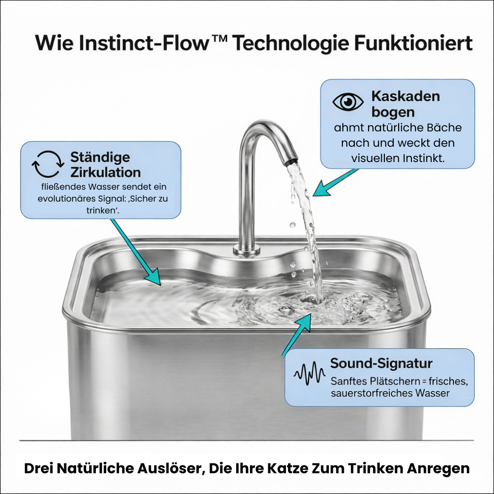 Katzen haben sich evolutionär dazu entwickelt, den Großteil ihres Wassers aus frischer Beute zu beziehen – nicht aus Wassernäpfen. Stehendes Wasser bildet bereits innerhalb weniger Stunden eine dünne Bakterienschicht (Biofilm) . Der extrem feine Geruchssinn Ihrer Katze erkennt das sofort – und für sie bedeutet das: „unsicher“ .