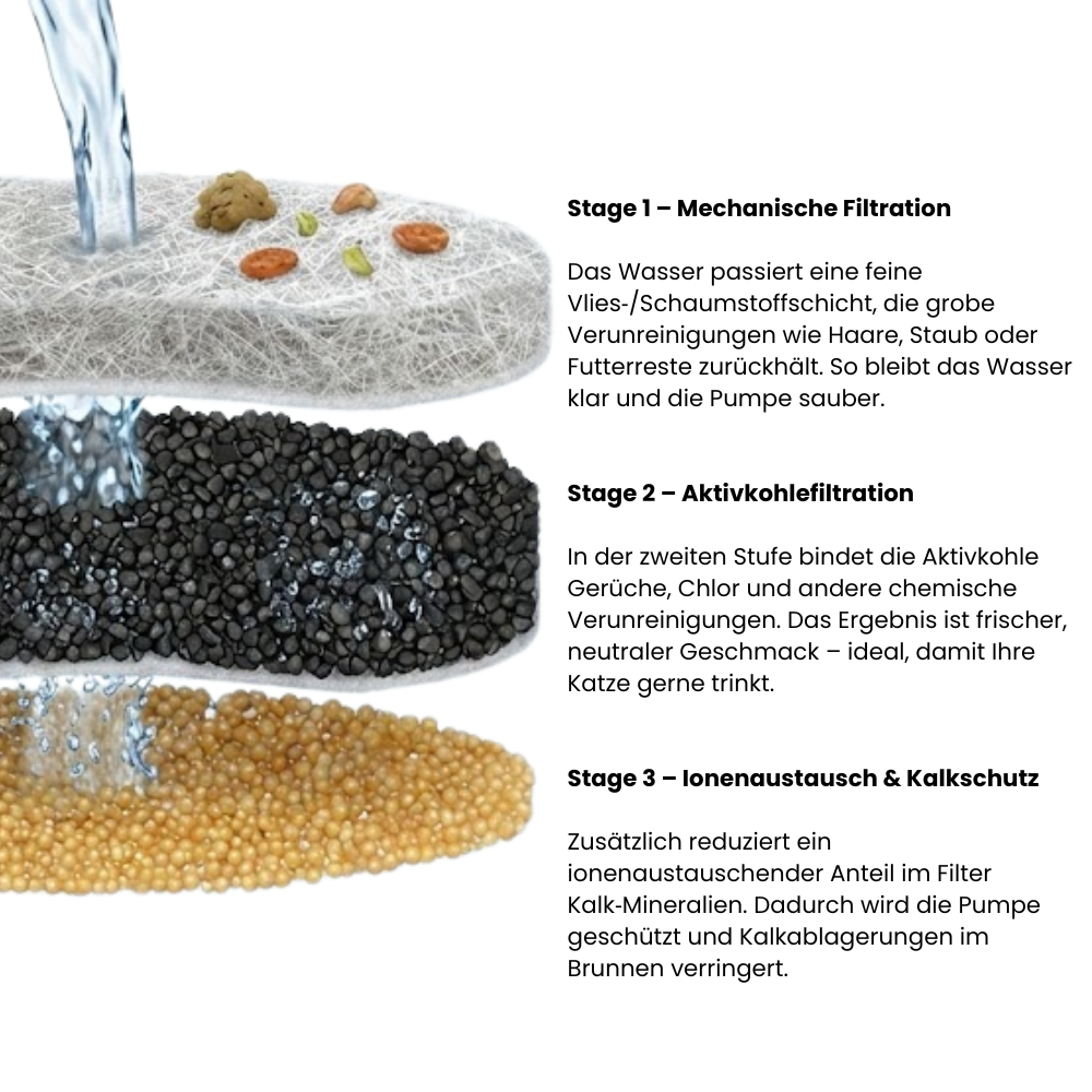 Die 3‑Stufen‑Filterung hält das Wasser sauber, frisch und frei von Ablagerungen – so unterstützt sie die Gesundheit Ihrer Katze und schützt ihre Nieren langfristig.